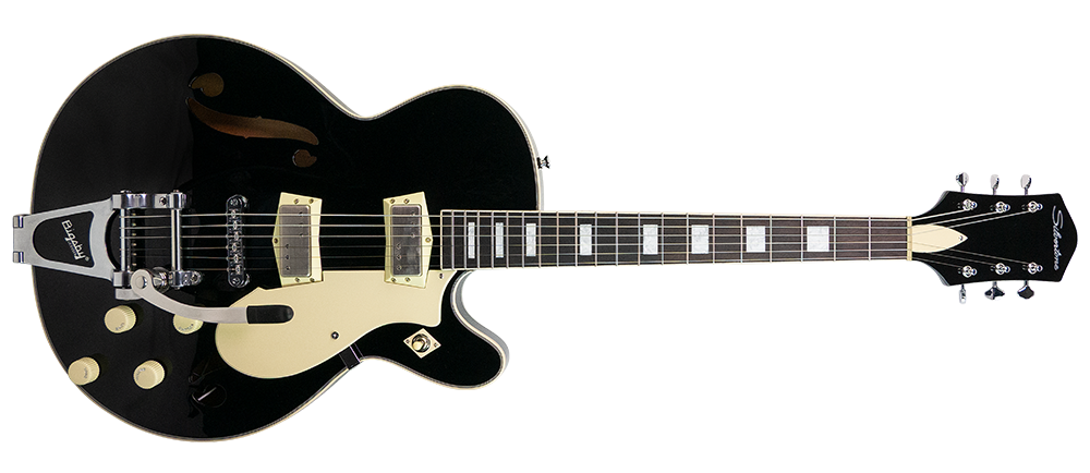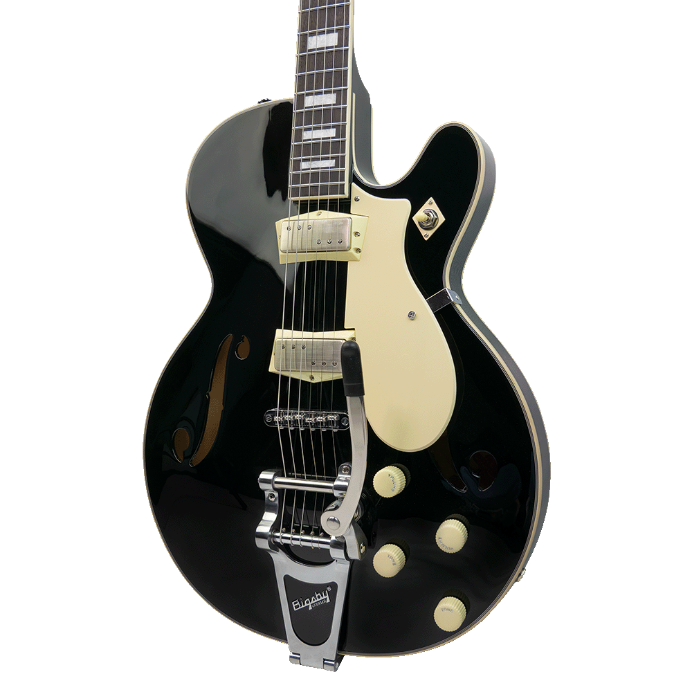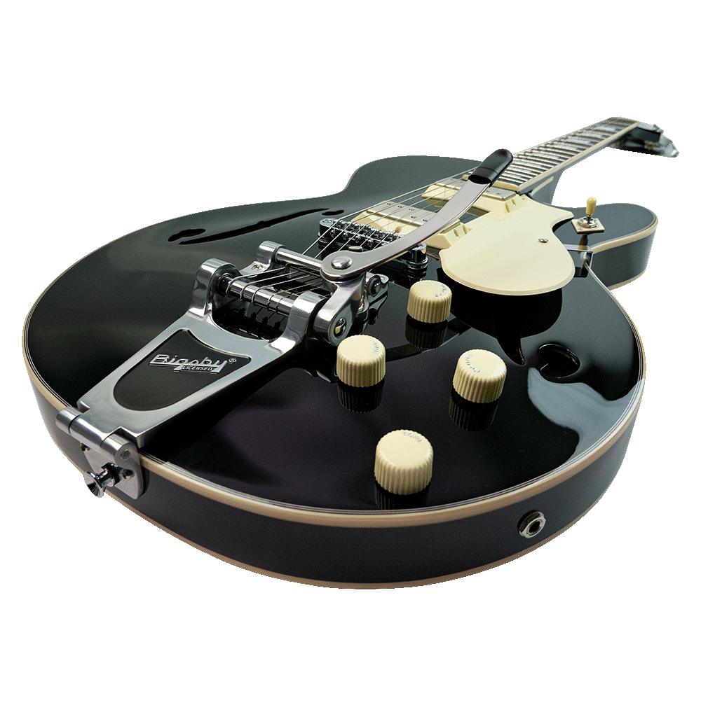 Distinctively, the 1446 comes equipped with a genuine Bigsby® B70 vibrato tailpiece paired with a Tune-o-matic style bridge featuring roller saddles for exceptional tuning stability.
